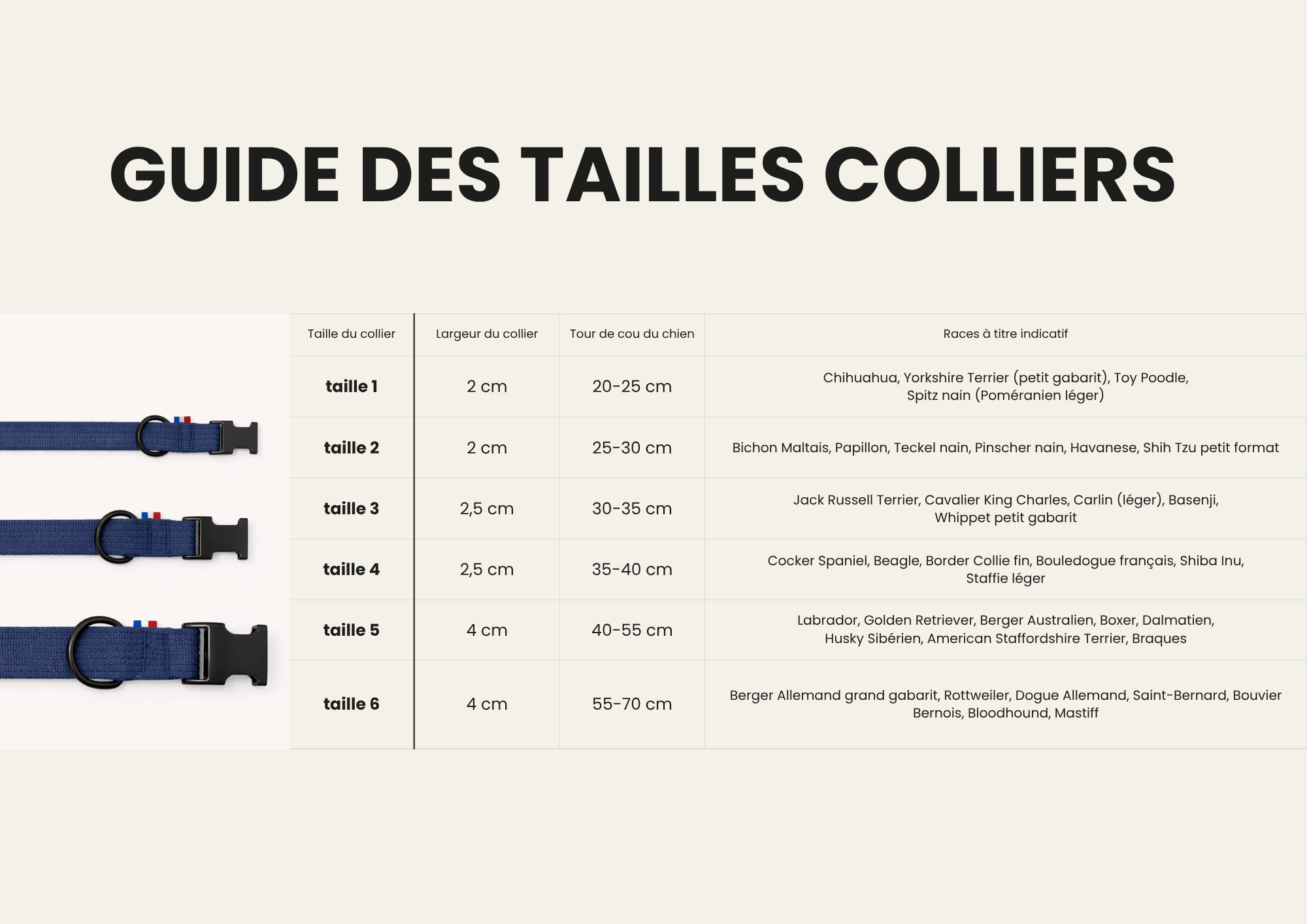 Notre guide des tailles vous aide à trouver facilement le modèle adapté, en fonction du tour de cou et du gabarit de votre chien. Les races indiquées sont données à titre indicatif, chaque chien étant unique.